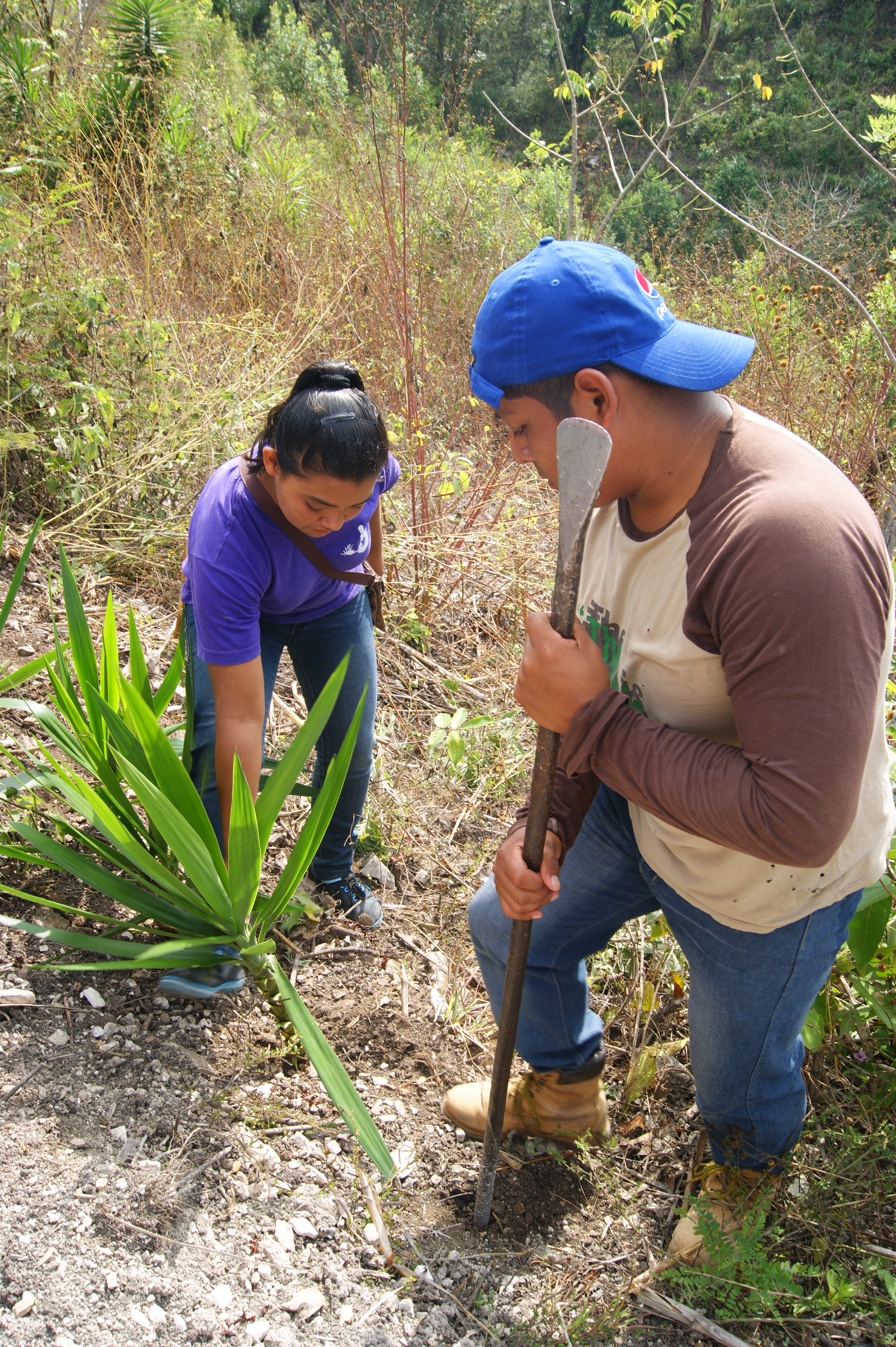 We followed Carolina and David up the switchbacks of a steep and crumbling hillside. In the now-blazing afternoon sun we took up metal stakes and picks, and dug holes to line the narrow path with Izote, a native relative of the aloe plant that thrives even on these hillsides.